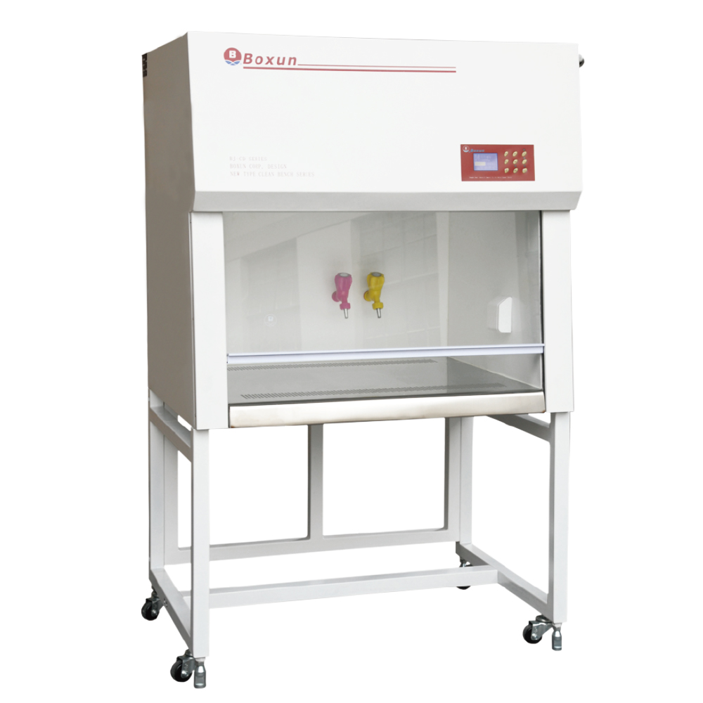 BJ-1CD The purification workbench is a purification device that can control high-clean air in the operating area through intelligent settings. The equipment adopts one-way air flow, and the indoor air passes through the prefilter and enters the net pressure box, then passes through the high-efficiency filter, and finally forms a highly clean one-way air flow in the operating area.