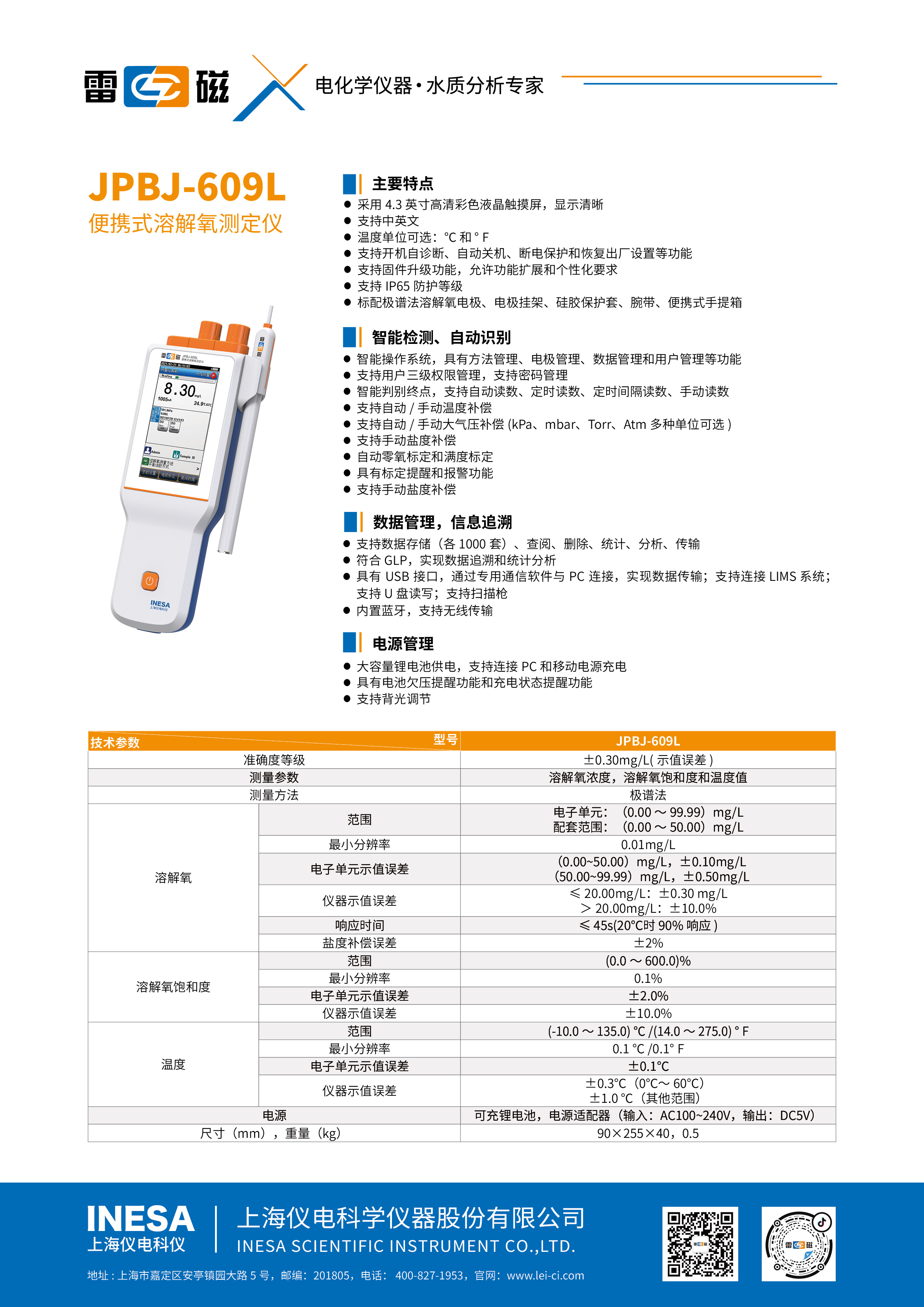 JPBJ-609L It is a new generation of intelligent high-end portable oxygen dissolving instrument. The instrument adopts a 4.3-inch color touch screen, with a new appearance design ; Intelligent operating system, supports zero oxygen and full-scale calibration, supports automatic compensation of atmospheric pressure, supports multiple reading methods, and supports data management functions ; At the same time, it uses lithium batteries to power, which greatly extends the use time of the instrument and facilitates users to use it on site.