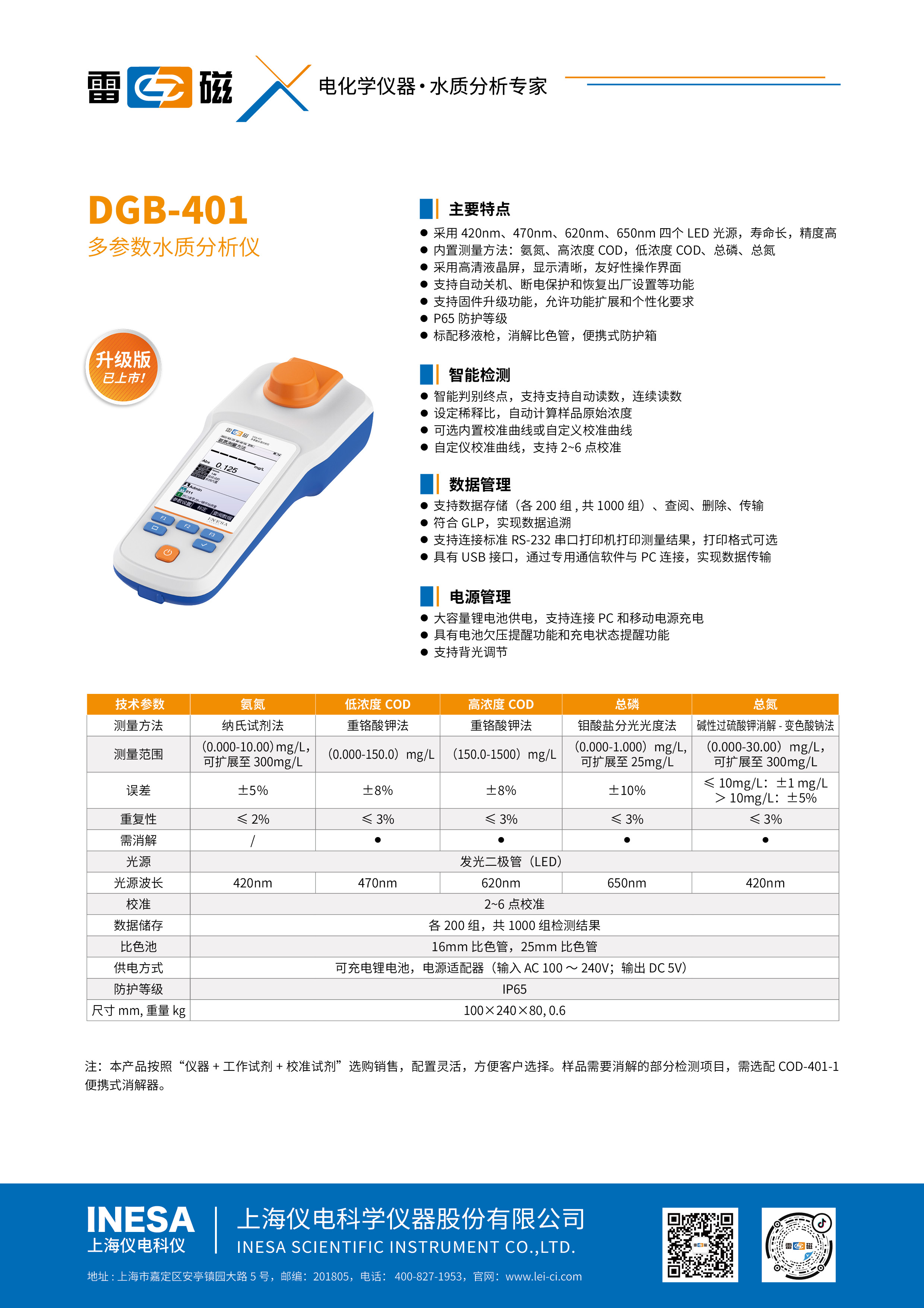 2、Using spectrophotometry, built-in high and low chemical oxygen demand ( COD)、 4 test items: ammonia nitrogen and total phosphorus;