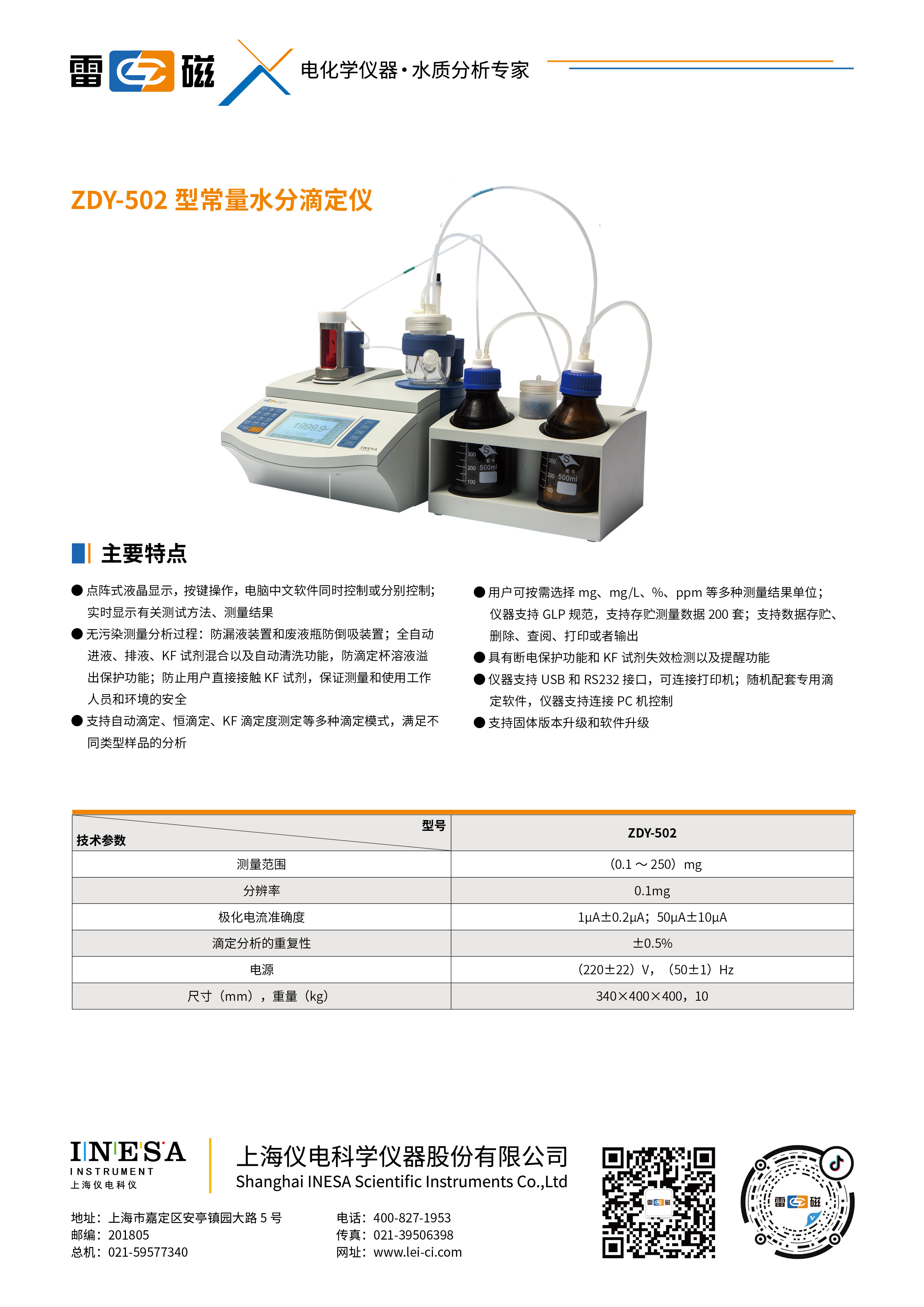 Pollution-free measurement and analysis process: liquid leakage prevention device and waste liquid bottle anti-sucking device; Automatic liquid inlet and drain, KF Reagent mixing and automatic cleaning function, protection against overflow of titration cup solution; Prevent direct contact from users KF Reagents to ensure the safety of the measurement and use staff and the environment;