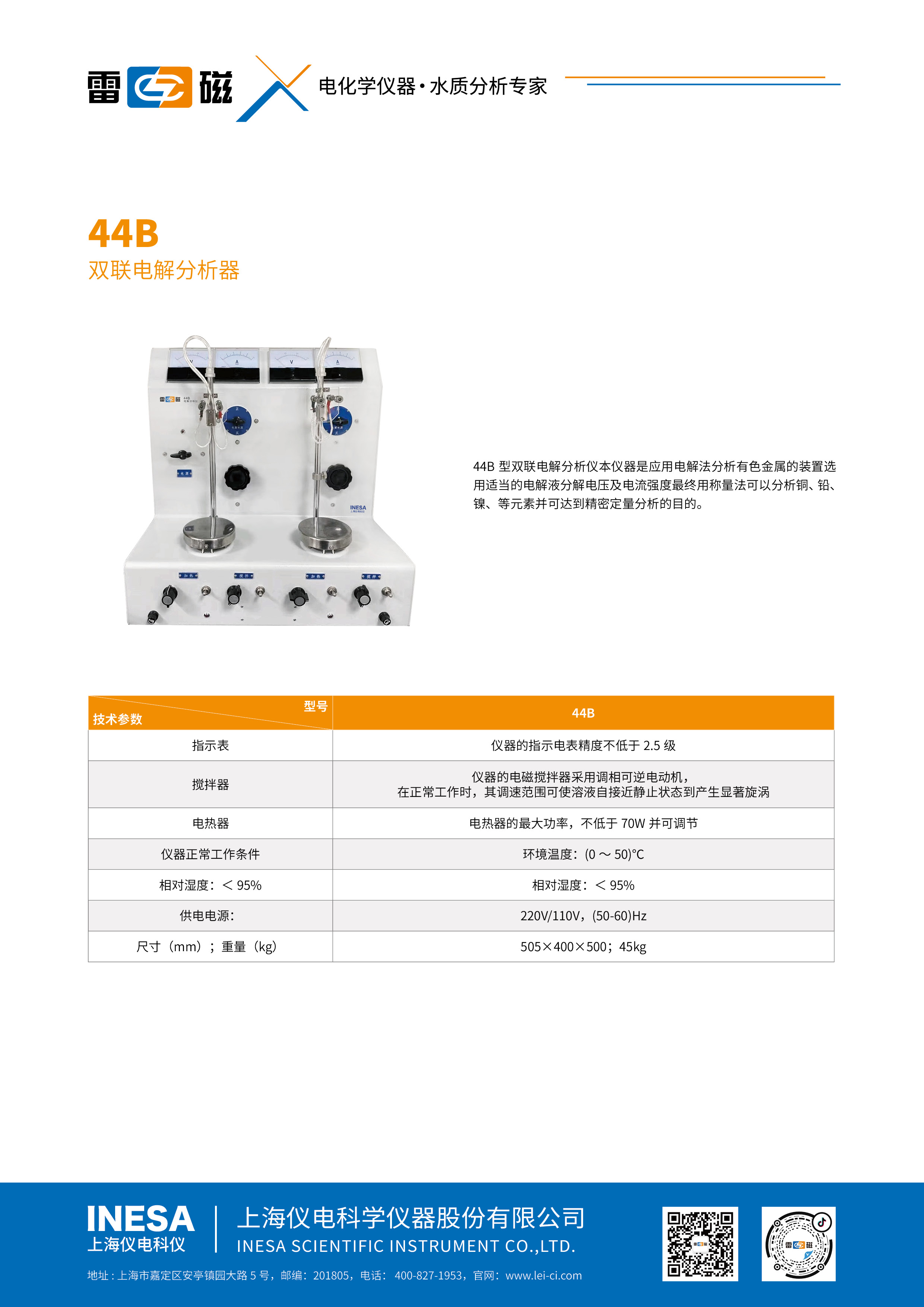 This instrument is a complete set of devices that use electrolysis to analyze non-ferrous metals. Selecting appropriate electrolytic solution, current intensity or decomposition voltage can analyze elements such as copper, lead, nickel, tin, zinc, etc., and achieve the purpose of precise quantitative analysis. Level 2.5 accuracy