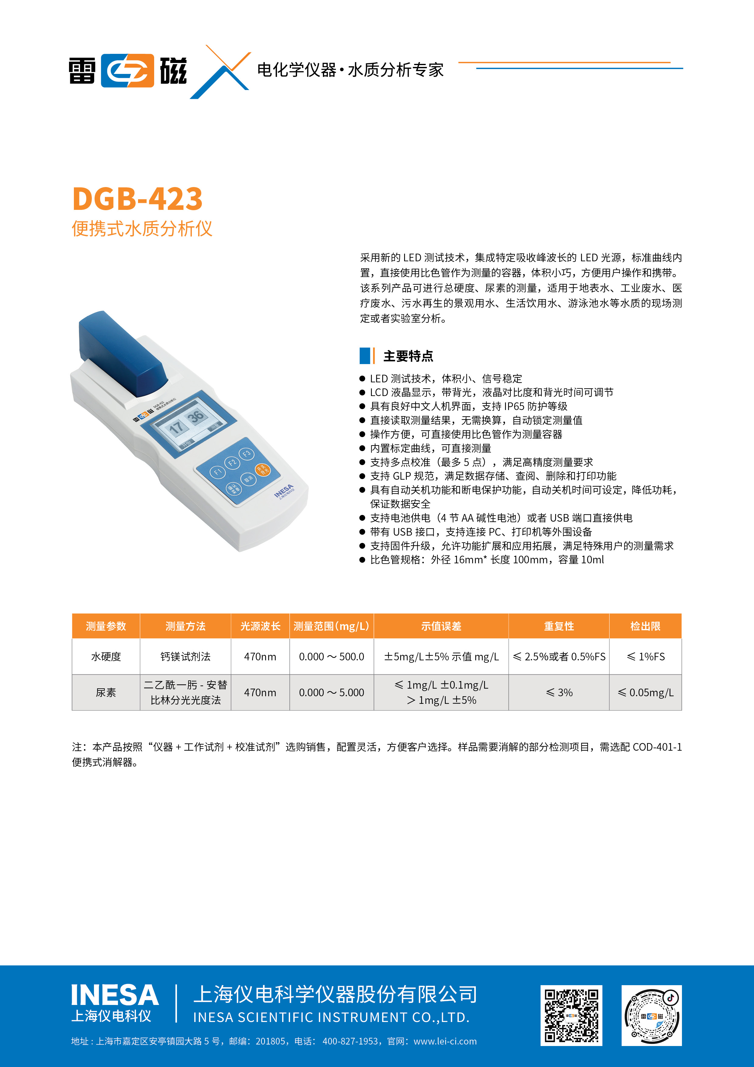 Water hardness | Calcium magnesium reagent method | 470nm | 0.000~500.0 | ±5mg/L±5%Demonstration value mg/L | ≤2.5%Or 0.5% FS | DGB-423 652200N00 |