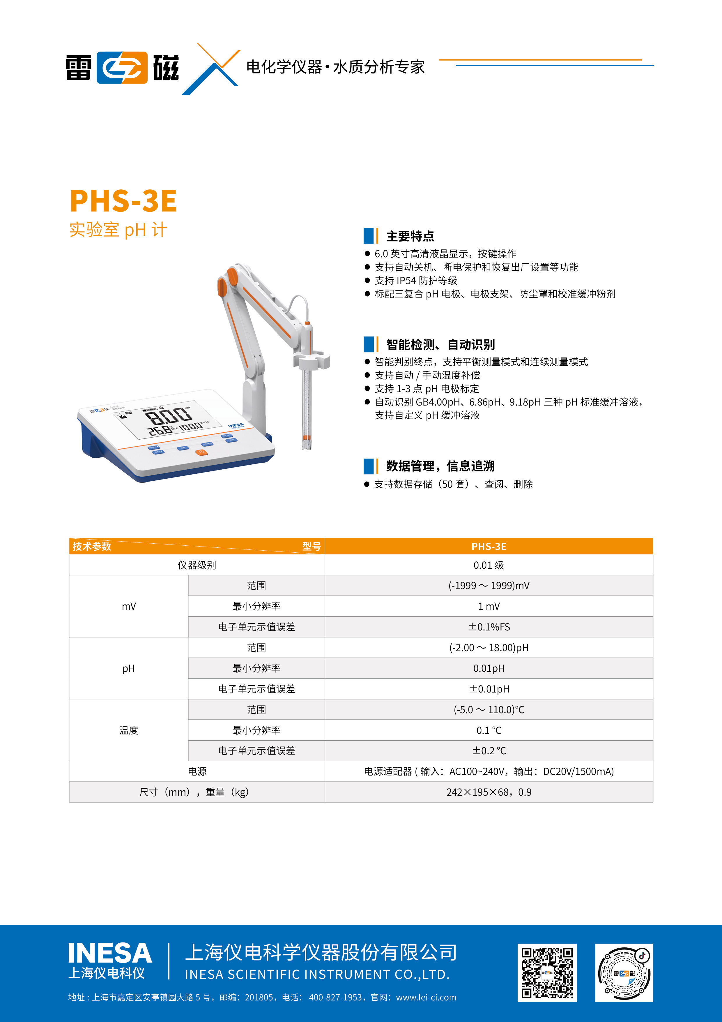 ● PHS-3E Supports automatic temperature compensation, can be measured pH、 temperature, mV。