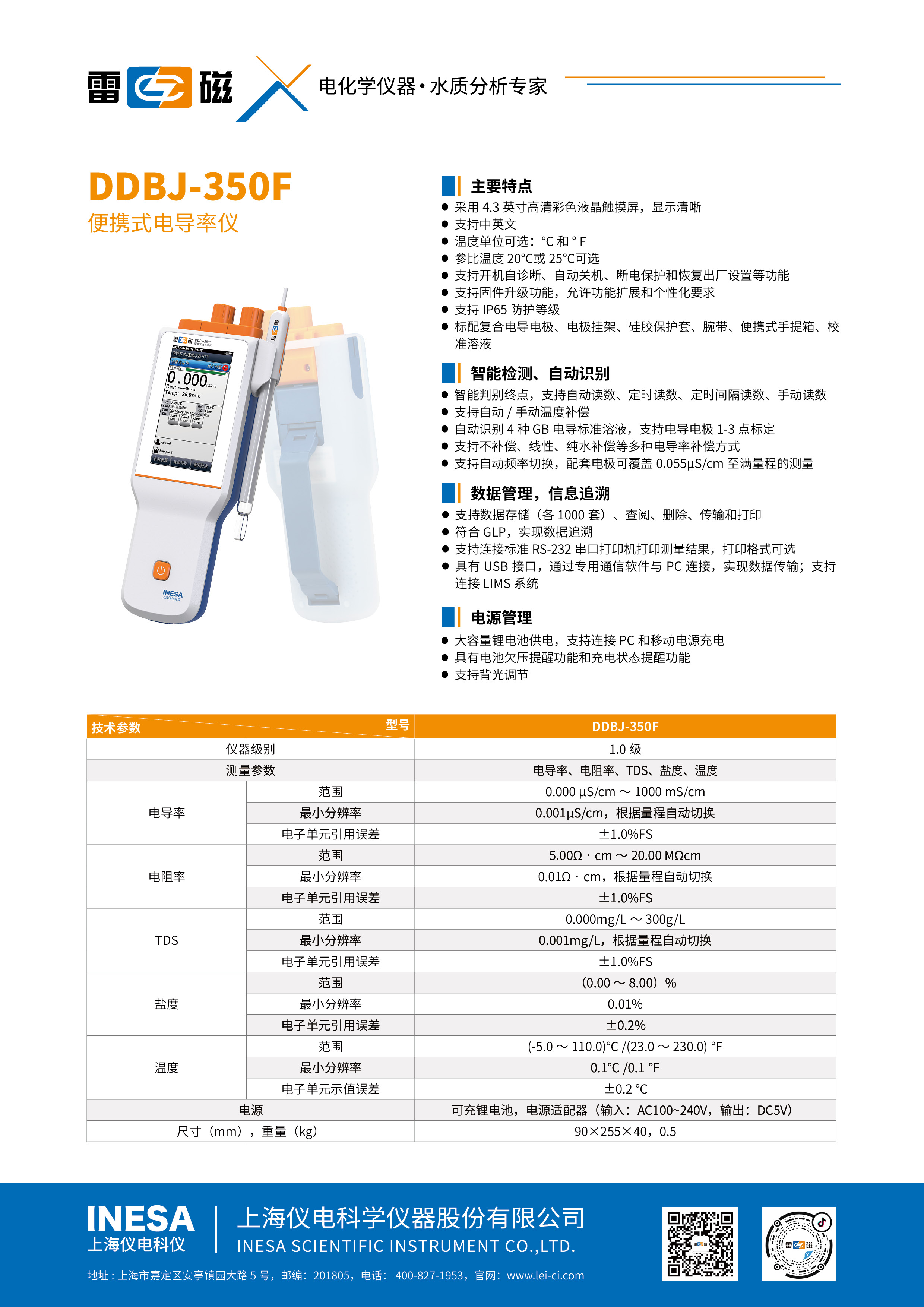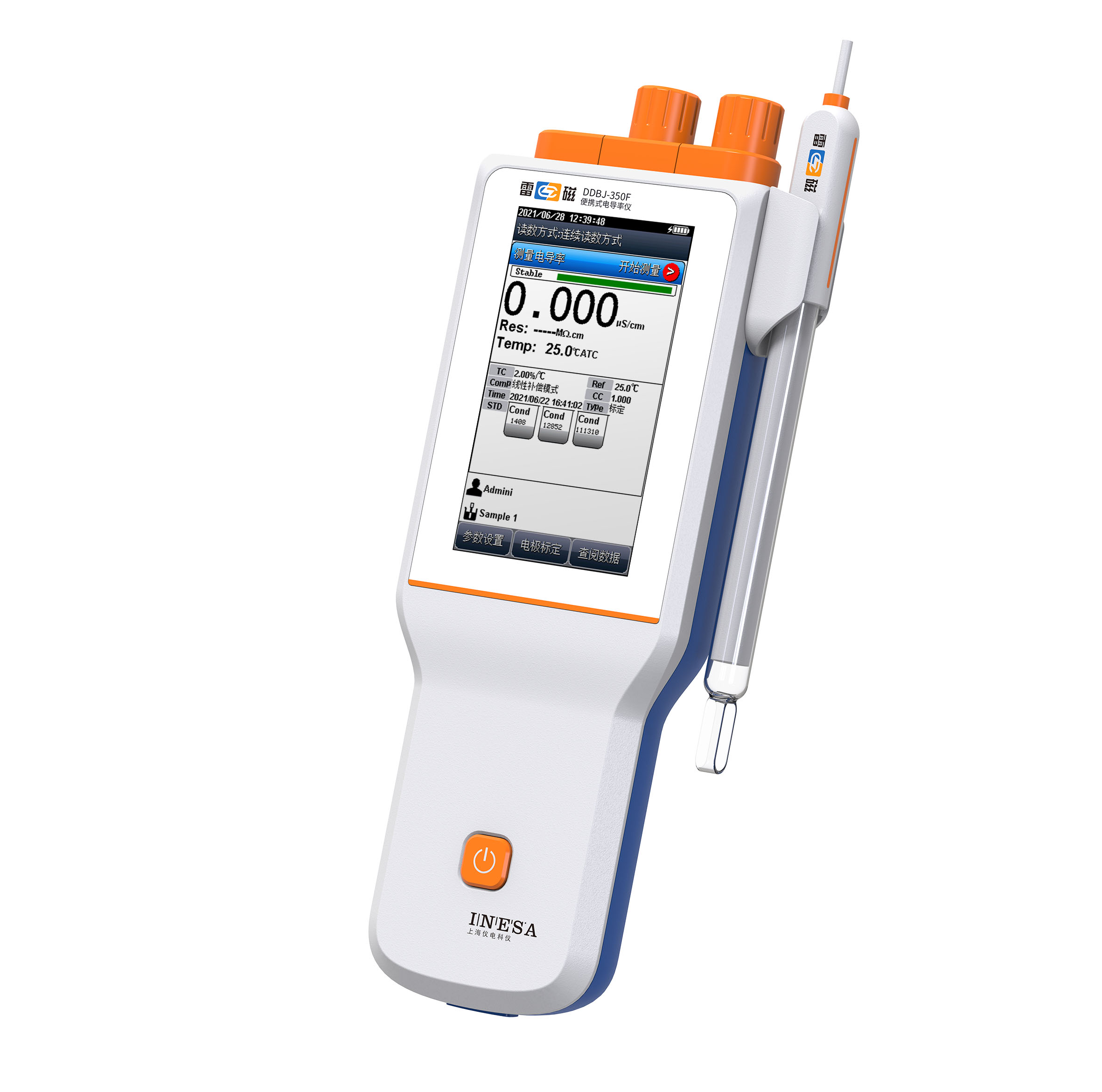 DDBJ-350F It is a new generation of intelligent portable conductivity meter. The instrument adopts a 4.3-inch color touch screen, with a new appearance design ; Intelligent operating system, supports multiple reading methods, multiple temperature compensation methods, and supports data management functions ; Powered by lithium batteries greatly increases the use time of the instrument and facilitates users to use it on site.
