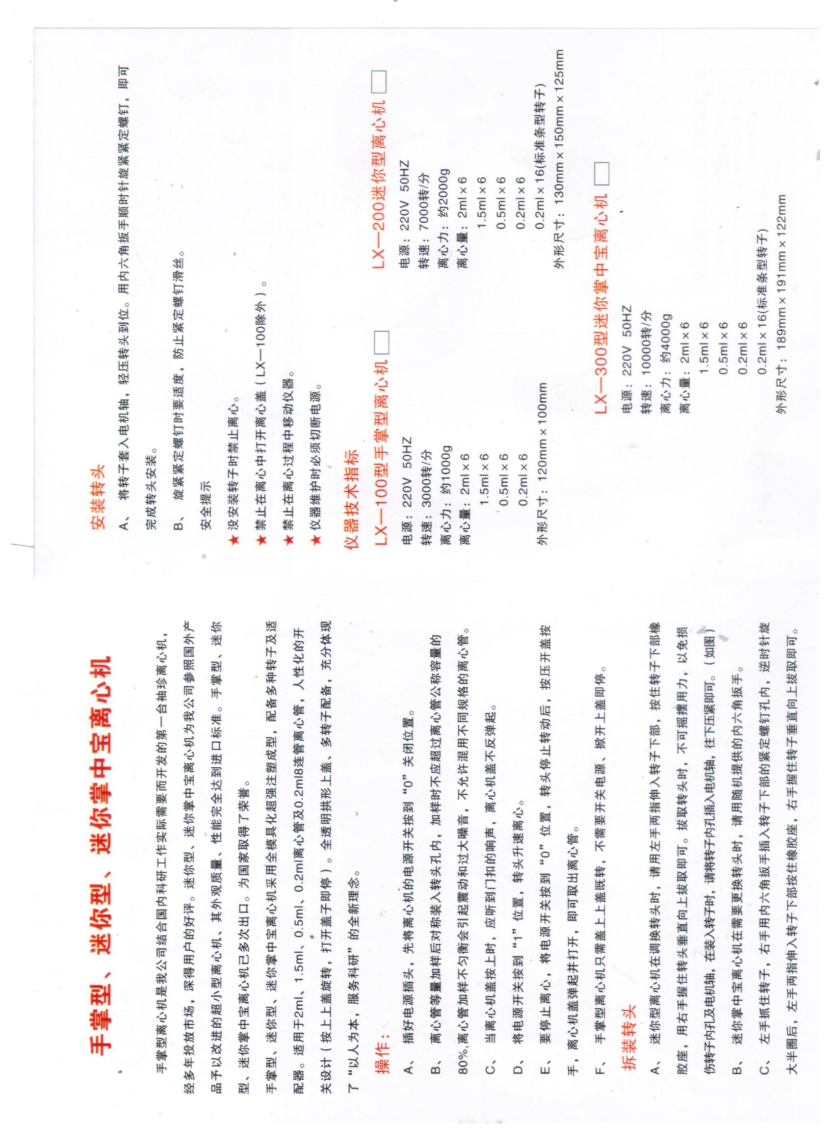 Fully molded super-strong injection molding, equipped with a variety of centrifugal rotors, suitable for 1 5 ml、0.5ml、0.2ml Centrifuge tube and PCR Use 0.2 ml8 The centrifuge tube completely replaces imported products. The humanized switch design (press the upper cover and rotates, and opens the cover and stops) is fully transparent arch-shaped upper cover and equipped with multiple rotors, which fully reflects the new concept of "people-oriented and scientific research".